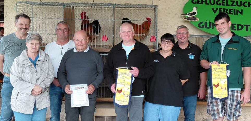 Ehrungen und besondere Auszeichnungen Im Rahmen der BSS wurden mehrere Züchter für ihre herausragenden Leistungen gewürdigt. Torsten Specht erhielt das Sussex-Band für eine 0,1 Sussex braun-porzellanfarbig. Als 1. Vorsitzender der Sussex-Züchter bedankte er sich herzlich beim RGZV Großenehrich und überreichte Dirk Beck ein kleines Gastgeschenk. Auch Christina und Lothar Schlegel wurden anlässlich ihrer Goldenen Hochzeit mit einem Präsent geehrt. Besonders erfreulich war die Teilnahme unseres neuen Mitglieds Sebastian Schwan, der bereits wertvolle Kontakte knüpfen konnte.